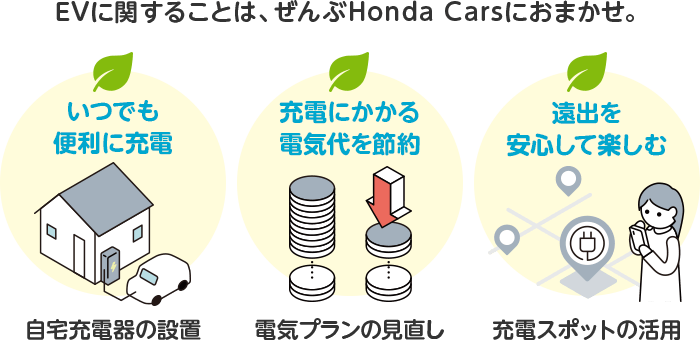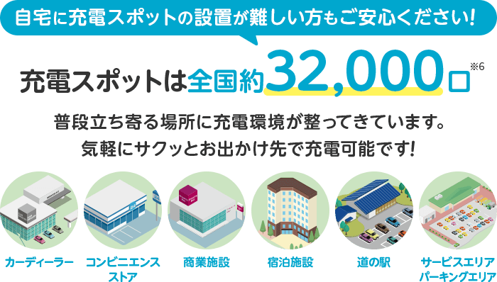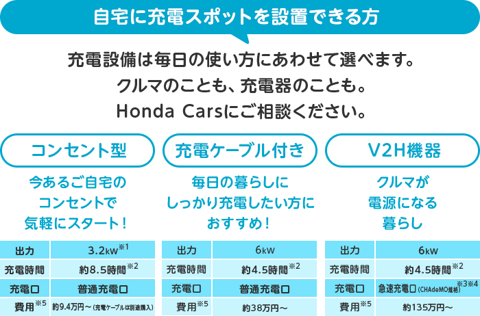 ※1 ディーラーオプションの充電ケーブル使用時。 ※2 普通充電は、充電残量警告灯が点灯した時点から、満充電までのおおよその時間。 ※3 この充電器のCHAdeMO規格(急速充電口)は、EVから家に給電するための規格です。EVへの充電スピードは普通充電(6kW)となります。 ※4 急速充電口はe: L4の場合、メーカーオプションとなります。 ※5 設置工事費込み。2025年4月時点。戸建て住宅の場合。本体価格+専用ブレーカー工事・配線の敷設・機器の壁面設置を行った場合の基本工事費の合計金額になります。工事内容によって別途追加工事費が発生する場合があります。※6 2024年5月時点。ゼンリン調べ。