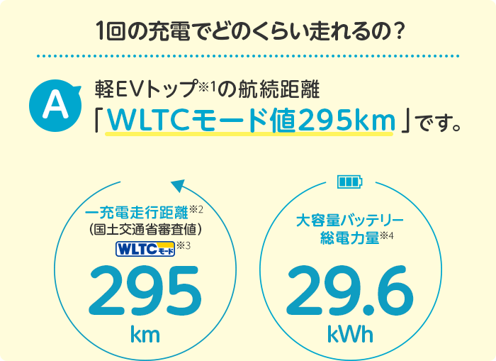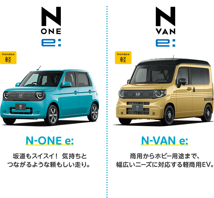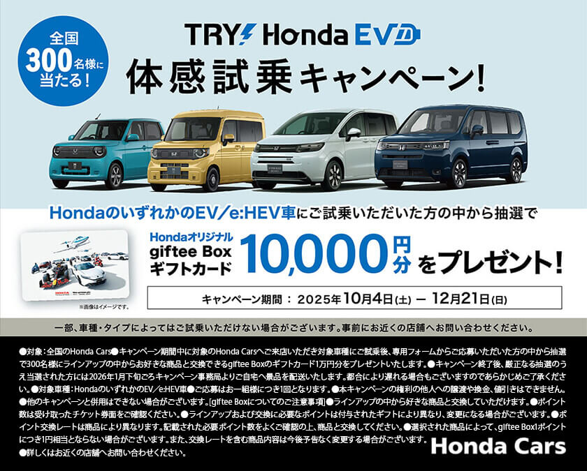 • ※1:2025年9月現在。Honda調べ。 ※2:一充電走行距離は定められた試験条件での値です。お客様の使用環境(気象、渋滞等)や運転方法(急発進、エアコン使用等)に応じて一充電走行距離は大きく異なります。 ※3:WLTCモード:市街地、郊外、高速道路の各走行モードを平均的な使用時間配分で構成した国際的な走行モード。 ※4:総電力量は、車両に搭載した電池のエネルギー量を表しています。国連危険物輸送勧告の定義に基づき算出した値であり、電圧(V)と容量(Ah)、セル数によって求められます。