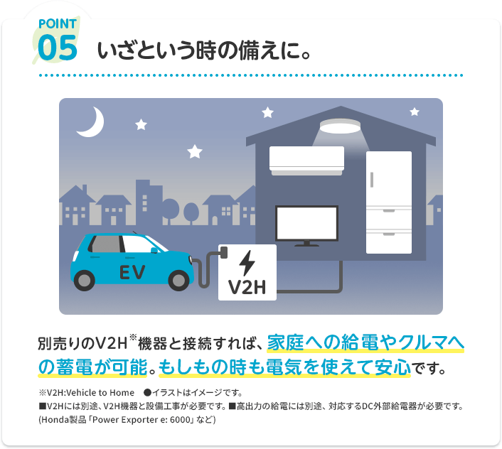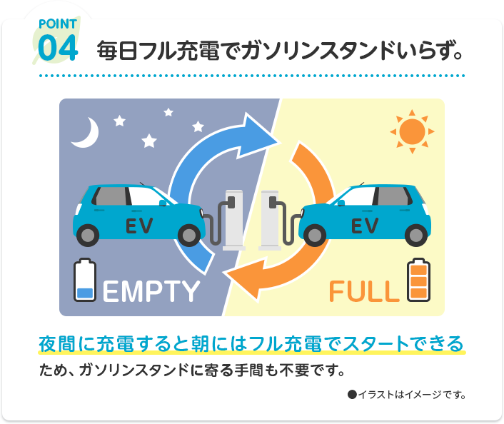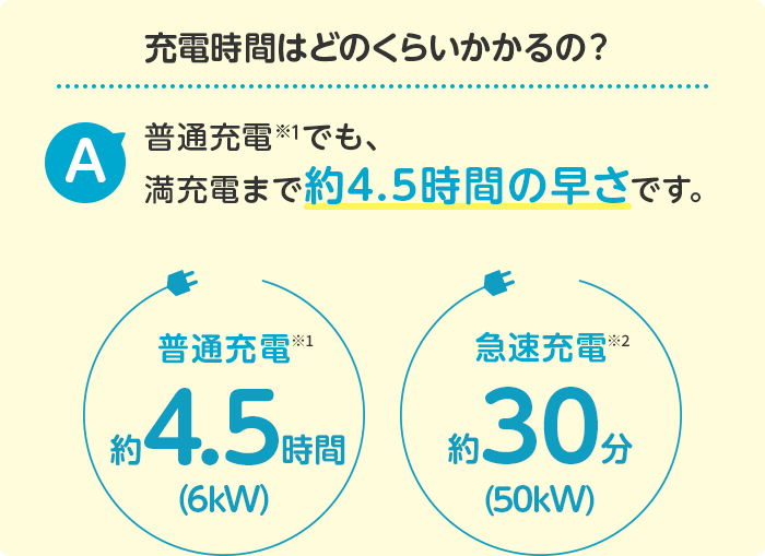 ※1 ディーラーオプションの充電ケーブル使用時。 ※2 普通充電は、充電残量警告灯が点灯した時点から、満充電までのおおよその時間。 ※3 この充電器のCHAdeMO規格(急速充電口)は、EVから家に給電するための規格です。EVへの充電スピードは普通充電(6kW)となります。 ※4 急速充電口はe: L4の場合、メーカーオプションとなります。 ※5 設置工事費込み。2025年4月時点。戸建て住宅の場合。本体価格+専用ブレーカー工事・配線の敷設・機器の壁面設置を行った場合の基本工事費の合計金額になります。工事内容によって別途追加工事費が発生する場合があります。※6 2024年5月時点。ゼンリン調べ。