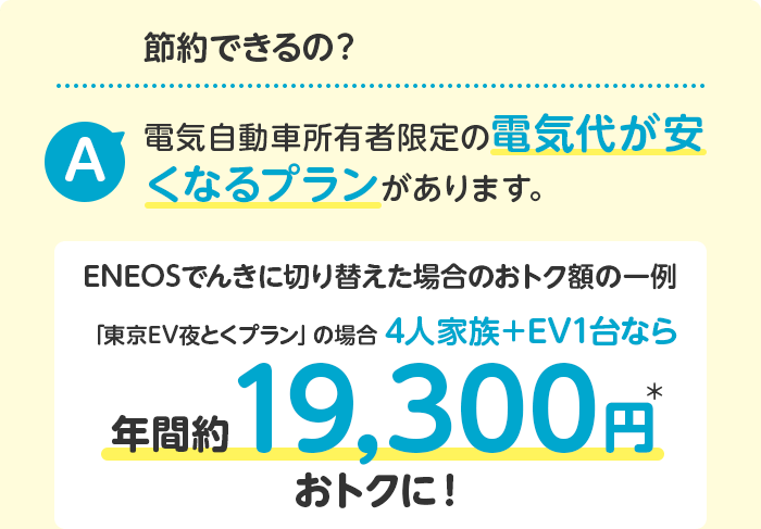 ※ENEOS Power(株)独自の前提による試算であり金額は参考値(消費税込)、にねん とく2割有り、燃料費調整額および再生可能エネルギー発電促進賦課金は含まず。EVタイムの使用量はEV充電量80kWhと平均月間使用量からEV充電量を差し引いた値の12%相当を合計したものといたします。